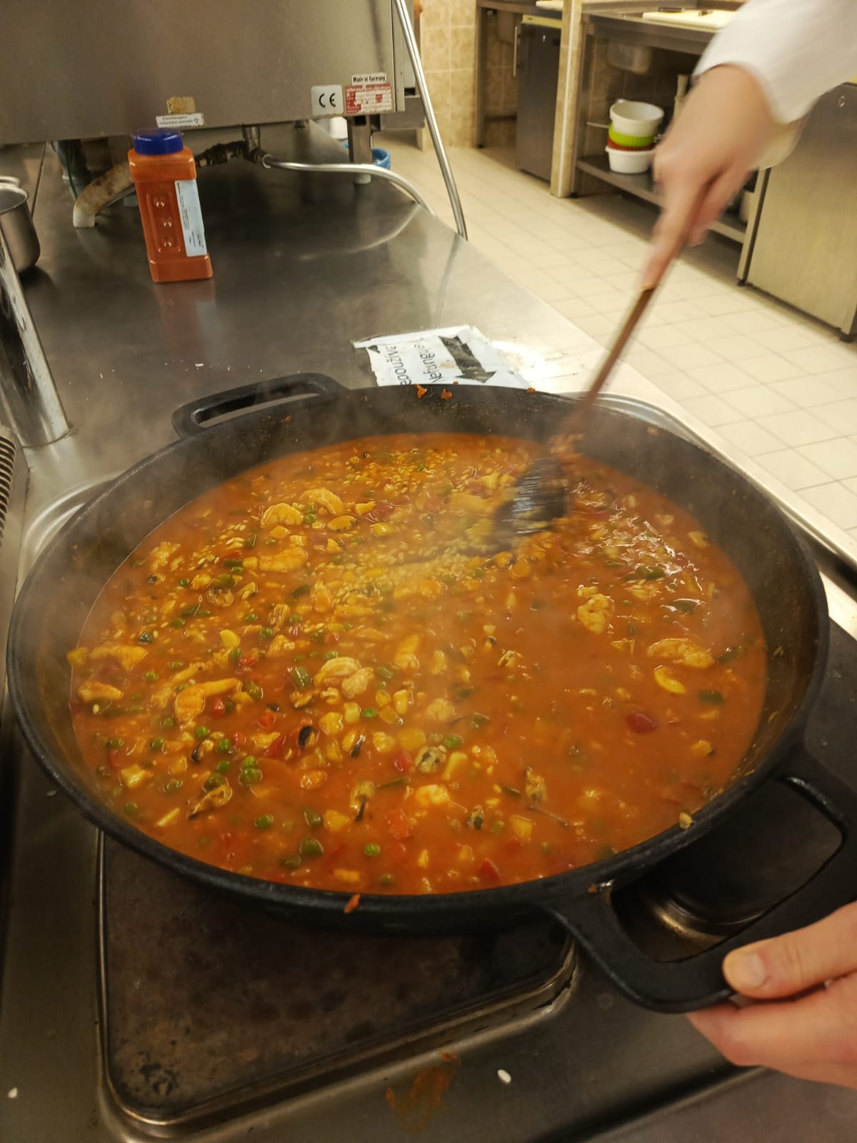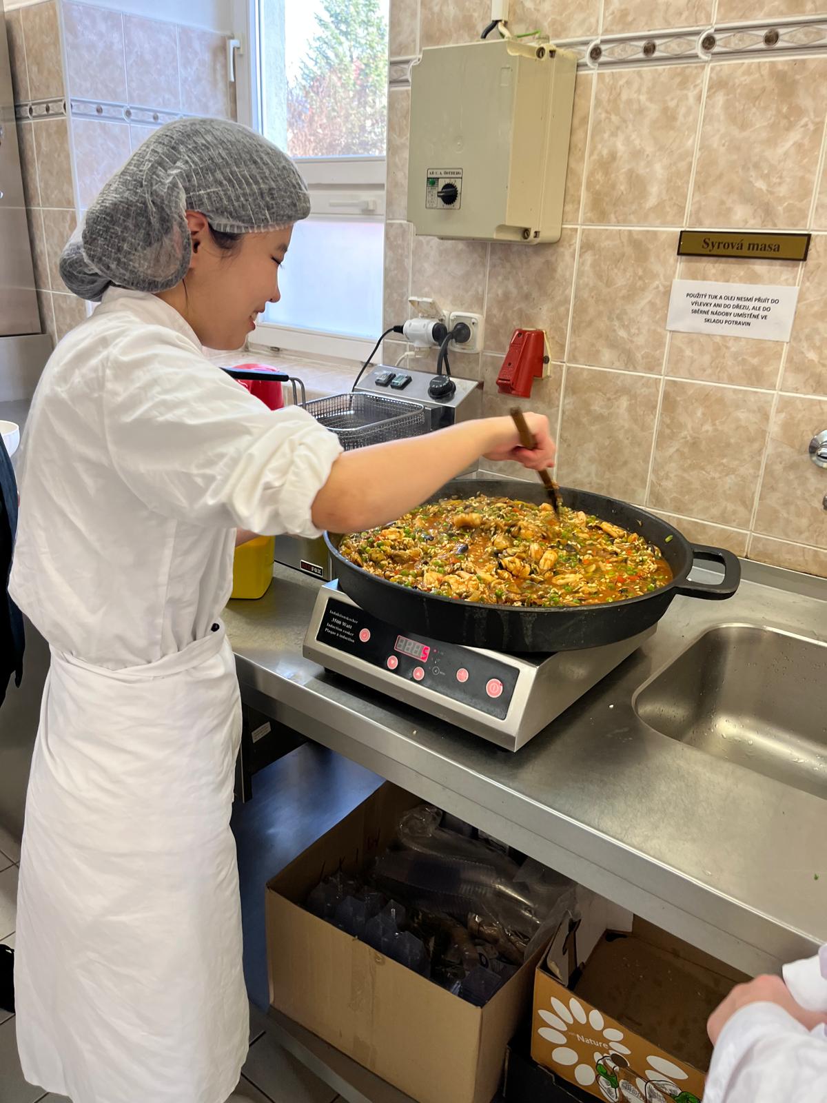 V druhé části workshopu se žáci přesunuli do Španělska, kde připravovali paellu – s mořskými plody, vegetariánskou i zeleninovou variantu této ikonické španělské speciality.